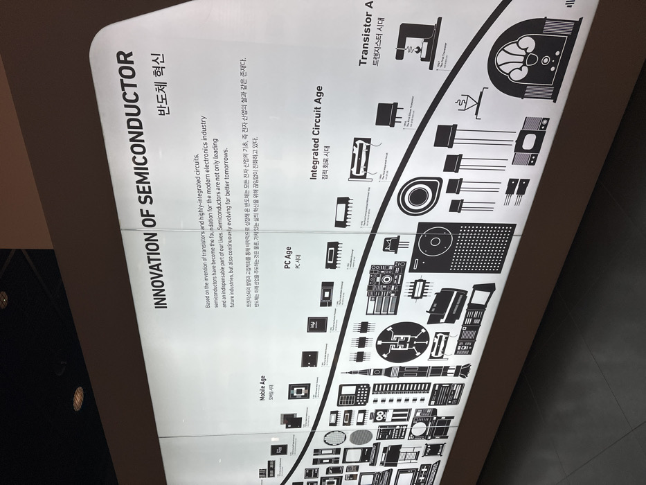 The image depicts an illuminated, white display panel within what appears to be a museum or exhibition hall, likely the Samsung Innovation Museum in Suwon-si, South Korea