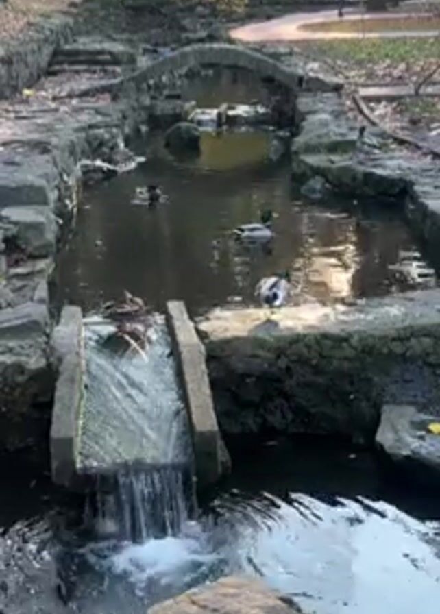 small stream in a park-like setting. The stream is lined with stone and features a small waterfall cascading over a stone ledge. Several ducks are present, some swimming in the water, some standing on the ledge or nearby rocks. A small stone bridge spans the stream further upstream. The surroundings include trees and fallen leaves, suggesting an autumn season. A walking path and a couple of people can be seen in the background.