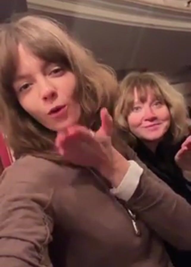 Two Caucasian women, with fair complexions and shoulder-length hair with bangs, are positioned in front of a camera. The woman in the foreground is wearing a brown long-sleeved shirt and a long necklace. She is holding her hand up as if blowing a kiss, then smiles. The woman behind her wears a black garment and has a similar expression. They appear to be in a theater setting, evidenced by ornate architectural details and rows of seats in the background. The scene is dimly lit, with subtle variations in light across the frame.