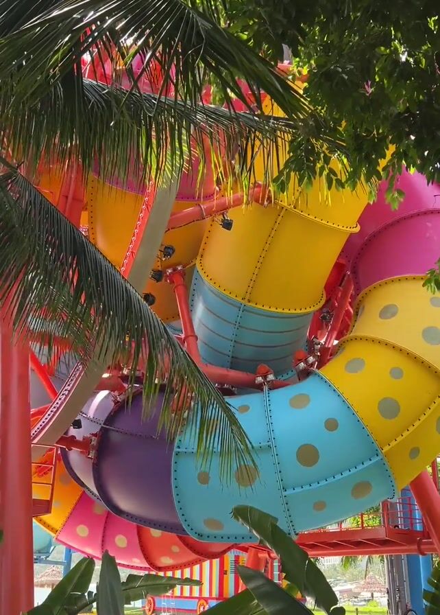colorful water park structure, primarily a large, twisting slide made of interconnected buckets. The slide features a vibrant array of colors: yellow, blue with gold polka dots, purple, orange, and pink. A red metal frame supports the slide's configuration. The slide is surrounded by tropical foliage, including palm trees and broad-leafed plants. Water flows through the slide, and people can be seen riding down within it. The shot is taken from a low angle, looking up at the structure through the vegetation.