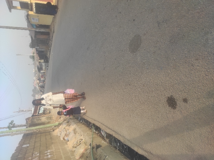 An eye-level shot on a paved road shows two girls walking along the edge. The taller girl wears a white t-shirt and patterned skirt with a pink bag. The smaller girl wears a darker outfit and carries a small white bag. Buildings line the roadside. Two dark patches stain the pavement. The photo captures an everyday moment on a residential street.