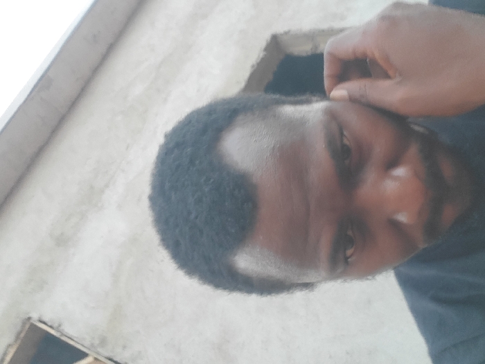 A man's face is tilted downward toward the camera. He has dark skin, short dark hair, and a beard. One hand touches his forehead near his hairline. Behind him is a light-colored wall with some dark spots and a small square opening above his head. The wall appears to be slightly angled. The man wears a dark blue or black shirt.