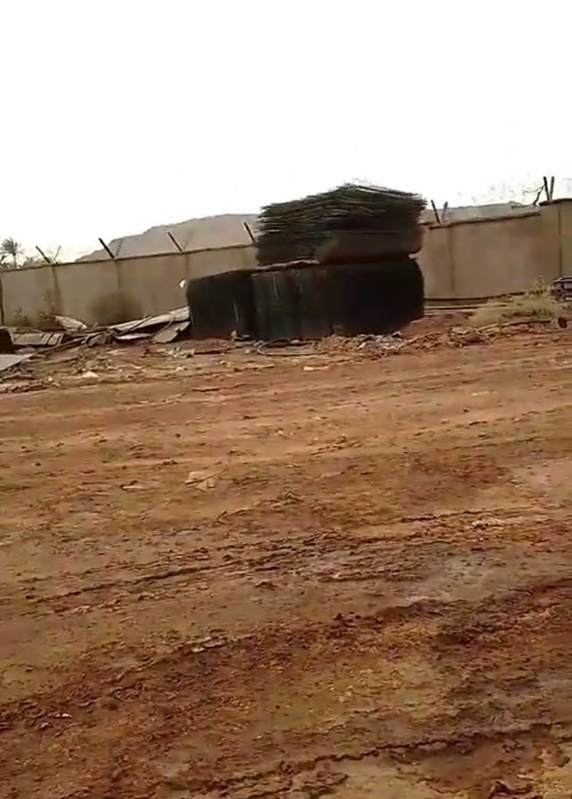 The camera moves through a large, muddy, flat open area. In the beginning, there are stacked objects and a tall wall behind them. Then, there are stacks of colorful shipping containers along the horizon. After that, construction equipment can be seen. Finally, the camera comes to a covered structure containing many blue and orange barrels.