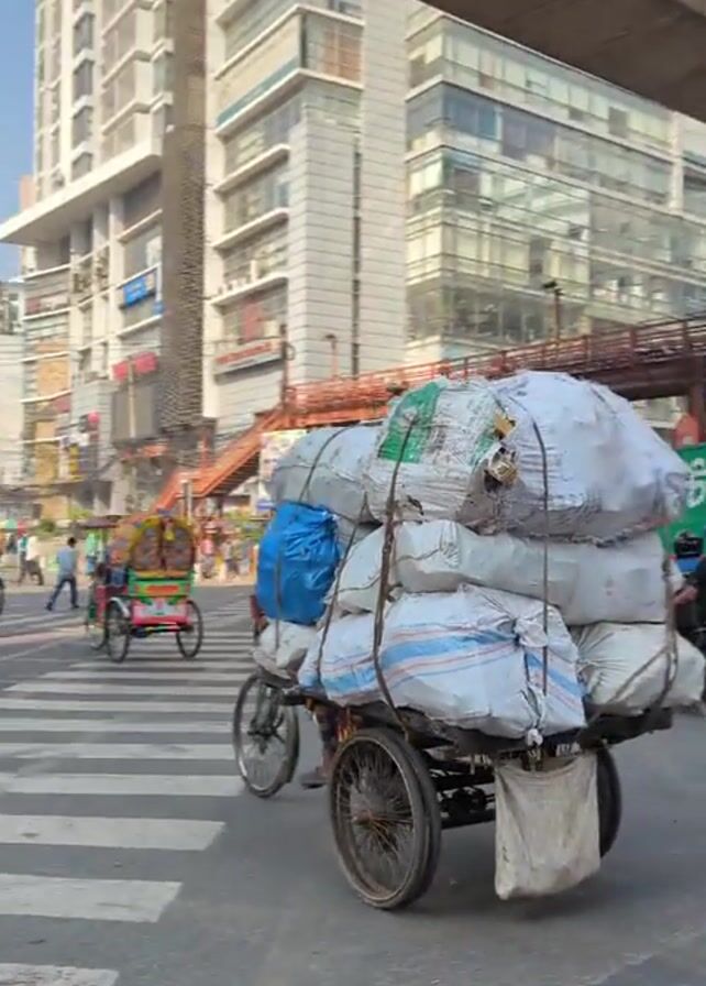 four-wheeled bicycle-powered cart heavily loaded with large white sacks being ridden on a city street. The sacks are stacked high and secured with ropes. A blue bag is visible among the white sacks. The cart moves slowly along a crosswalk. In the background are buildings, an elevated roadway, other pedestrians, and rickshaws. The sky is clear and bright.