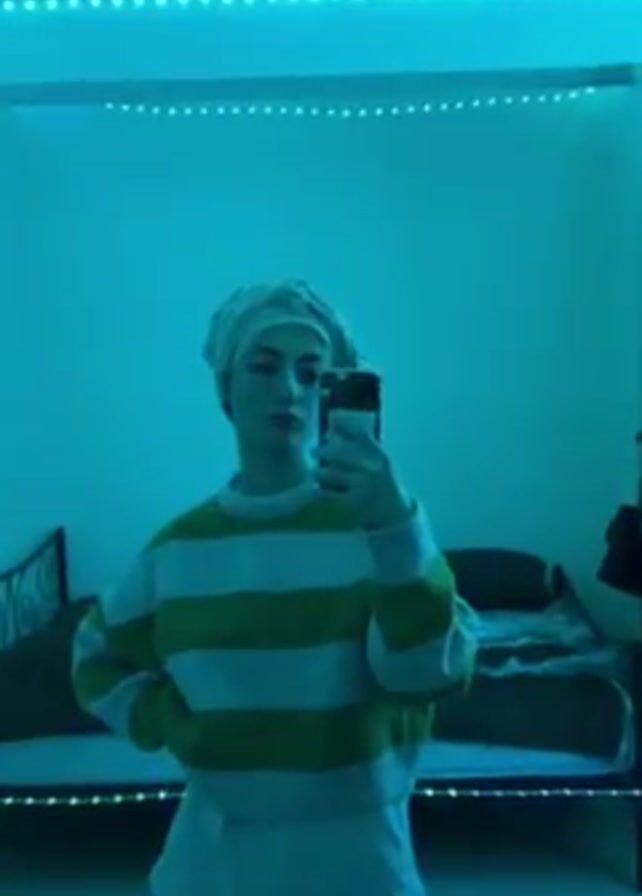 A person stands in front of a mirror in a room. The person is wearing a white head covering, a green and white striped sweater, and green pants. They are holding a phone and taking a selfie. The lighting in the room changes from green to purple and back to green. In the background, there is a bed with a red blanket and pillows, as well as a shelf and other furniture. The camera moves up and down, showing the person from different angles. Later, the camera angle changes, showing just the person's legs from the knee down as they walk away from the mirror.