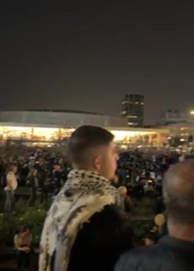 The video captures a scene of a large crowd of people gathered at night in what appears to be a public square or park, with a modern building illuminated in the background. The crowd is densely packed, and individuals of various ages are visible, some wearing scarves. The camera moves through the crowd, showing faces and profiles. The atmosphere suggests a gathering or protest, possibly with speeches or presentations taking place, as evidenced by a visible screen in the distance. The overall tone is serious and focused.