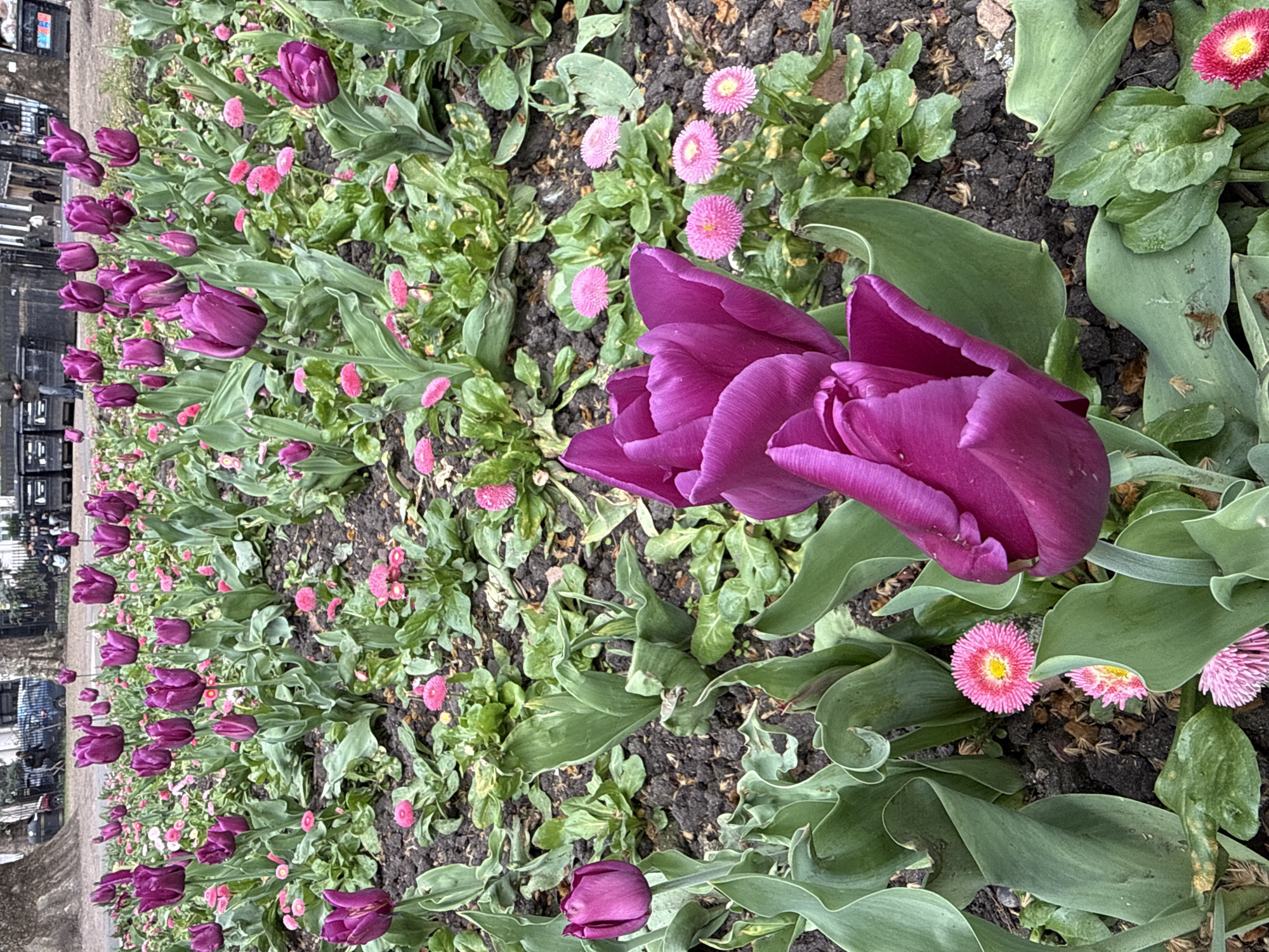 A ground-level shot displays a row of deep purple tulips and small pink daisy-like flowers planted in soil, likely in London, United Kingdom