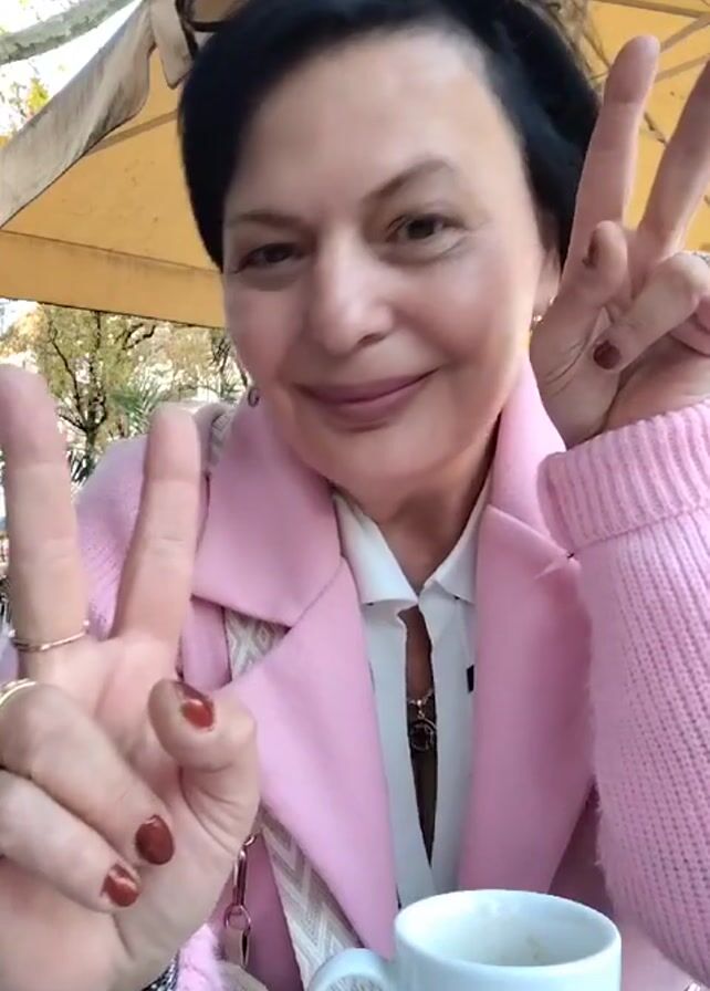 A medium shot features a smiling woman at an outdoor cafe. She has short dark hair and fair skin, wearing a pink coat over a white collared shirt. Sunglasses rest on her head. She holds up both hands, each forming a peace sign. Her nails are painted a dark red color, and she wears several rings and bracelets. A white coffee cup sits on the table in front of her. An umbrella is partially visible overhead, and blurry foliage can be seen in the background.