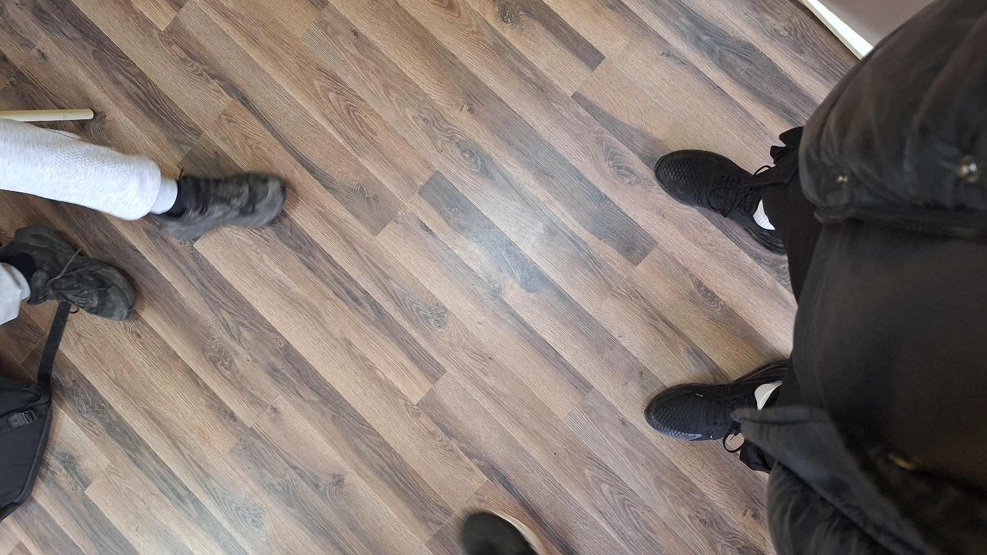 The image presents an overhead perspective of an indoor floor. The flooring consists of laminated wood planks exhibiting varying shades of brown and gray, arranged in a diagonal pattern relative to the camera's orientation. In the foreground, the lower torso, legs, and feet of the individual capturing the image are visible. This person wears black athletic shoes with a textured upper surface, white ankle socks, and black trousers. A portion of a dark, likely padded, outer garment with visible metallic snap fasteners covers the upper thighs. In the upper portion of the frame, the lower extremities of two other individuals are discernible. Towards the upper-left, one individual is partially visible, wearing dark athletic footwear, white socks, and light gray sweatpants. A black backpack with a visible strap rests on the floor next to their feet. Towards the upper-right, another individual's right leg and foot are visible, also wearing dark athletic footwear, white socks, and light gray sweatpants. This foot exhibits motion blur, suggesting movement. A segment of a light-colored, possibly metal, chair leg is partially visible adjacent to this individual. The individuals appear to be standing or in motion within an interior space. The specific location within the city of Knezha, Bulgaria, cannot be determined from the visual information provided in this image.