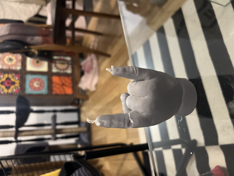 A gray hand-shaped sculpture rests on a glass table with black and white stripes. The sculpture is posed with the index finger and pinky extended, while the other fingers are curled inwards. Remnants of white string or fiber are adhered to the fingertips. In the background, there's a multi-colored, patterned cabinet and wooden furniture.