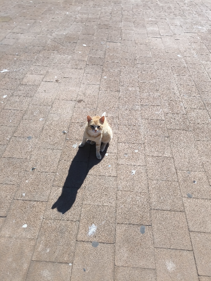 - "A medium-sized domestic cat, predominantly light orange-tan with white fur on its muzzle and chest, stands on a sunlit, rough-textured paved surface in Essaouira, Morocco" by FM-jgNAL2, licensed under CC BY 4.0