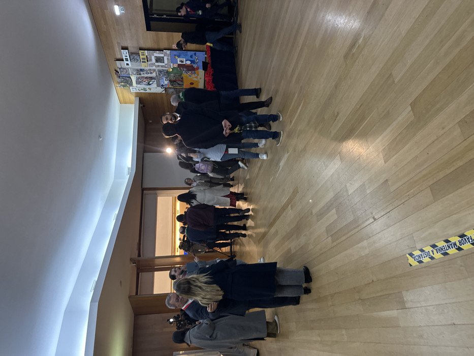 A group of people stand on a polished wooden floor in a large room. Most faces are not visible, but some individuals wear masks. The group appears to be observing artwork displayed on a table at the far end of the room. A yellow and black caution tape with Spanish writing is visible on the floor. The room is well-lit.