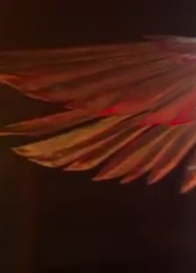 person with large decorative angel wings standing on stage. The stage is dark with red and white spotlights shining on the performer. The view then shifts to a crowd of people in a dark room with hands raised in the air. Bright white and red spotlights shine down on the crowd. The scene appears to be at a performance or concert.