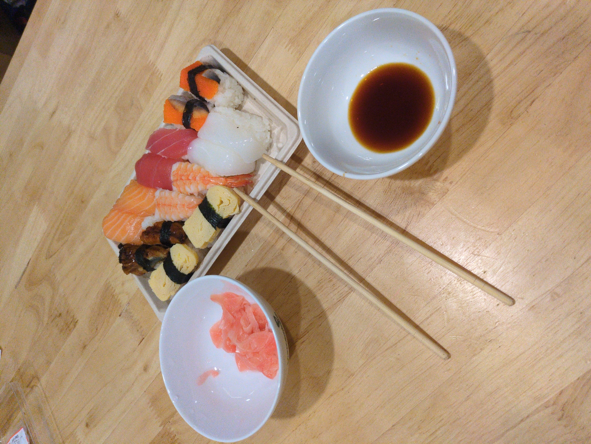 The scene shows a selection of sushi arranged in a white tray on a light brown wooden table