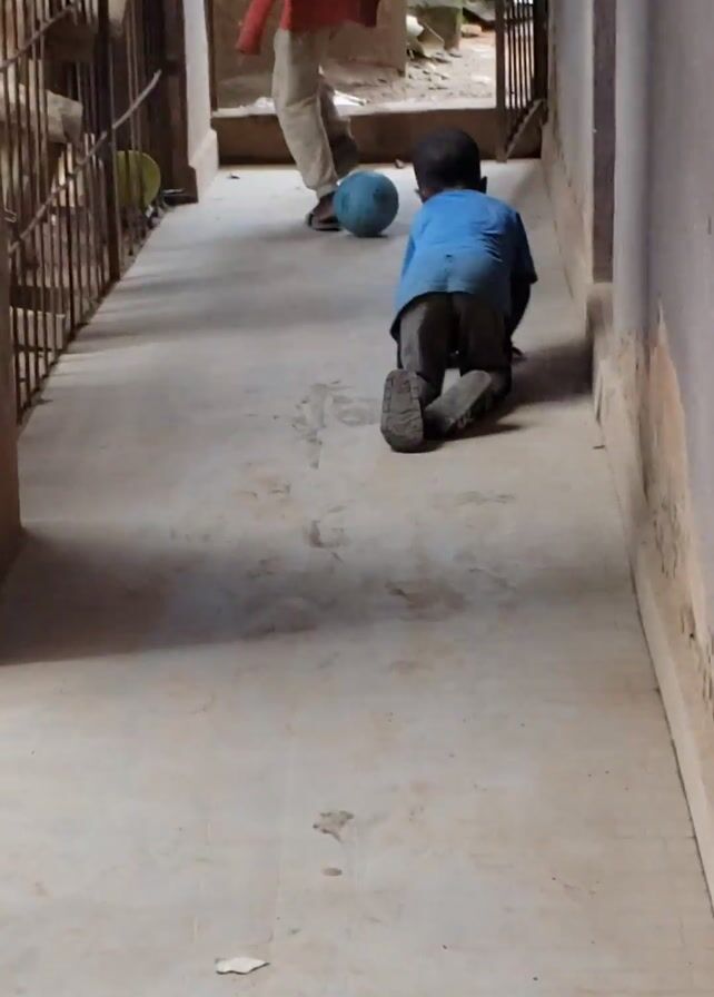 In a narrow indoor corridor, two young boys interact with a blue ball. The corridor has a concrete floor and ceiling with gated openings on the left. The boy on the right is kneeling, wearing a blue shirt and dark pants. The boy on the left is standing, wearing a red long-sleeved shirt and khaki pants. He kicks the blue ball down the corridor.