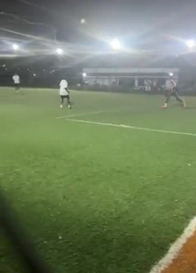 n outdoor, artificial turf soccer field under bright lights at night. Several players are dispersed across the field, wearing different colored jerseys, including white and brown/green. A soccer ball is in the air, moving towards one of the players in a brown/green jersey. The camera appears to be positioned on the edge of the field, behind a net. Spectators can be seen in the background.