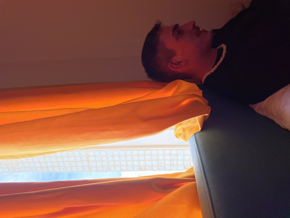 A man reclines on a gray couch. He wears a dark sweater with a white trim around the neck. The window behind him is covered with golden orange curtains, with the bright sky visible through a grid. The room's lighting appears warm and soft, casting a red hue on the man's face. The viewpoint is from below, looking up at the man and the window.