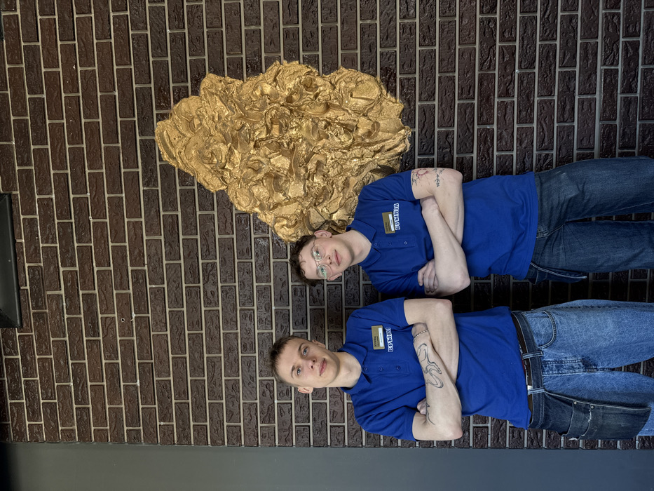 Two young adult males are positioned side-by-side against a dark brown brick wall. Both wear royal blue short-sleeved polo shirts with white name tags affixed to their left chests, displaying the Cyrillic text 'БРЫНЗА' and additional smaller text. Their arms are crossed, and they maintain direct eye contact with the camera, exhibiting slight smiles. The male on the left has short, light brown hair and visible tattoos on both forearms, including a prominent wavy design on his right forearm. He wears light-wash jeans with a dark fabric utility pouch secured to his right hip. The male on the right has curly, light brown hair, wears round, clear-framed glasses, and has small tattoos on his left forearm; he is dressed in dark-wash jeans. Mounted on the brick wall to the right of the subjects is a large, irregularly shaped, heavily textured gold-colored abstract sculpture, resembling a large metallic nugget or geological formation. A vertical dark grey panel frames the left side of the scene. The setting is a commercial interior in Saint Petersburg, Russia, consistent with an establishment named 'Брынза'.
