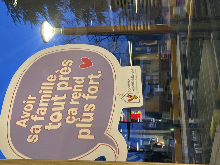 The image features a sign for the Ronald McDonald Foundation in French, displayed on a window