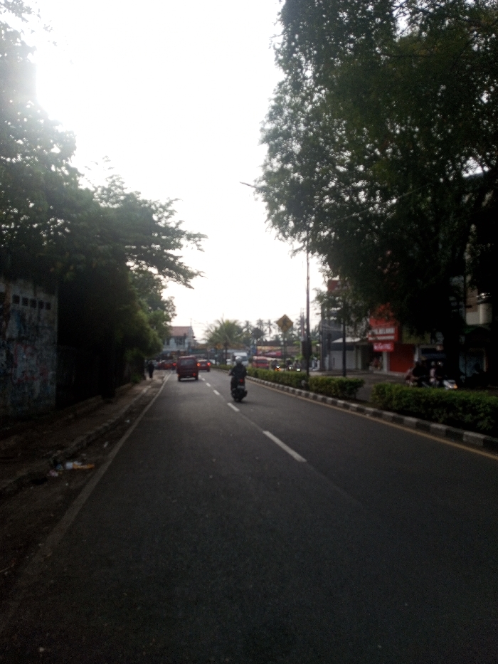 The image depicts an urban street scene in San Pya, Myanmar, observed from a low perspective looking down the road. The sky is bright white, suggesting significant overhead light or overexposure, with a sun flare visible in the upper left corner. The asphalt road surface occupies the central and lower portions of the frame, marked with a solid white line on the left edge and a dashed white line indicating a lane further right. A dark-colored motorcycle with a rider in a helmet is positioned on the right side of the road, traveling away from the viewer. Further down the left lane, a red sedan is also moving away. Other vehicles, including additional red cars and a larger vehicle, are visible in the distance. On the left side of the road, a dark, unpaved or gravely shoulder runs alongside a low, dark wall or building facade partially covered in graffiti. Dense, dark green foliage from trees overhangs this area, casting significant shadows. A lone individual is discernible walking on this shadowed path in the mid-ground. On the right side of the road, a concrete median strip with low, green, manicured hedges separates the traffic lanes. Beyond the median, a row of power poles and additional trees line the street. Further in the background, commercial buildings and storefronts are visible, one featuring a prominent red sign with white lettering. A yellow, diamond-shaped road sign is mounted on a pole on the right side. Palm trees are also visible among the distant foliage. The overall lighting creates a high-contrast scene with deep shadows in the foreground.