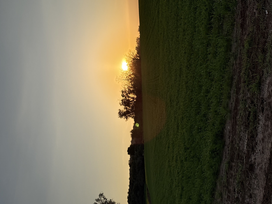 A horizontal landscape features a bright setting sun obscured by leafless trees. Golden light radiates across the sky and illuminates a green field that occupies the foreground. To the right of the field is a strip of dark, tilled soil. Distant trees create a dark boundary along the bottom edge. The scene is bathed in the warm hues of sunset.