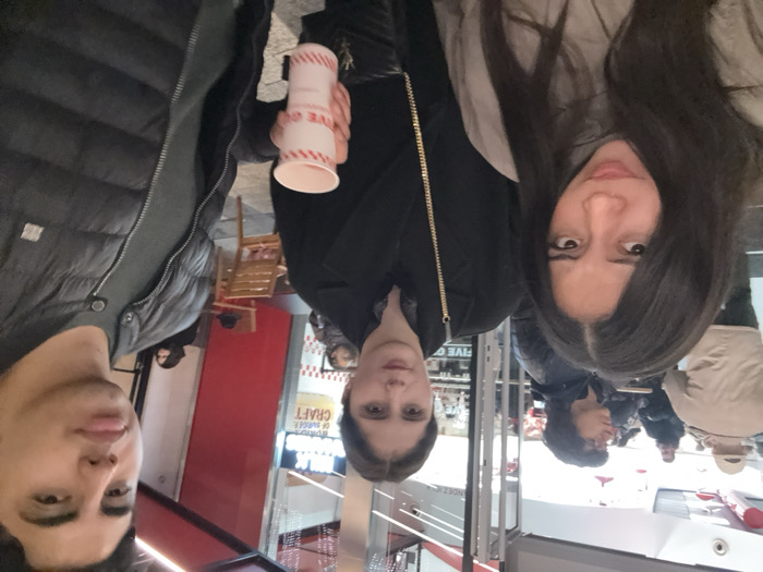 Three individuals are clustered together indoors. A fair-skinned person on the left wears a dark puffer jacket and gray top. Another fair-skinned person is centered, dressed in a black coat and holding a red-and-white striped cup. A darker-haired individual to the right is wearing a beige jacket. The background indicates they may be in a Five Guys restaurant, visible with red and white decor. Several other patrons are visible in the blurred distance.