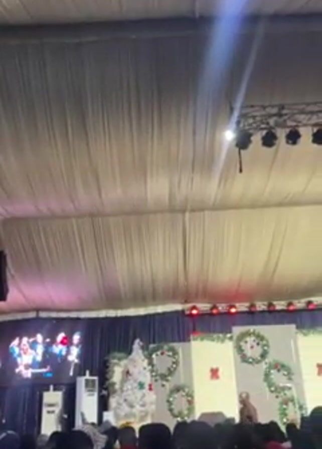 n event taking place inside a large tent-like structure with a white fabric ceiling. A stage is set up at the front, decorated with Christmas wreaths and a white Christmas tree. A man is speaking on stage, with a screen behind him displaying images of other people. There is a crowd of people seated in front of the stage, listening to the speaker. Above the stage, there are multiple spotlights attached to a metal frame. The lighting is bright, and the overall atmosphere appears to be festive.