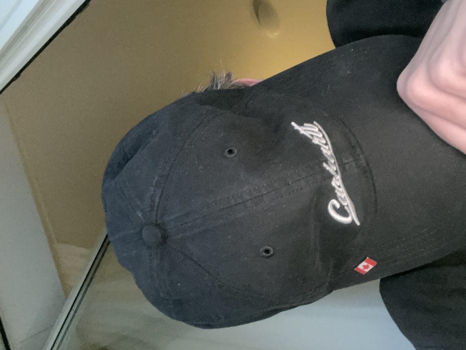 The image displays a close-up, low-angle perspective of an individual, primarily focusing on their head and upper torso. The person's face is obscured by a black baseball cap worn with the brim forward. The cap features a white embroidered "Carhartt" script logo on the front, and a small Canadian flag lapel pin is affixed to the wearer's left side of the front panel. Light-colored hair is visible under the rear of the cap, protruding on the right side of the frame. A light-skinned hand, with two fingers visible, is positioned in the lower right foreground, appearing to touch the chin or neck area. The individual is wearing dark-colored clothing beneath the cap. The background is out of focus, showing a light brown wall in the mid-ground and a white frame, possibly a window or door jamb, in the upper left. A blurry, light-colored circular object, consistent with a ceiling light fixture, is partially visible in the upper right background. The image provides no visual information to confirm the specified location of Dortmund, Germany.