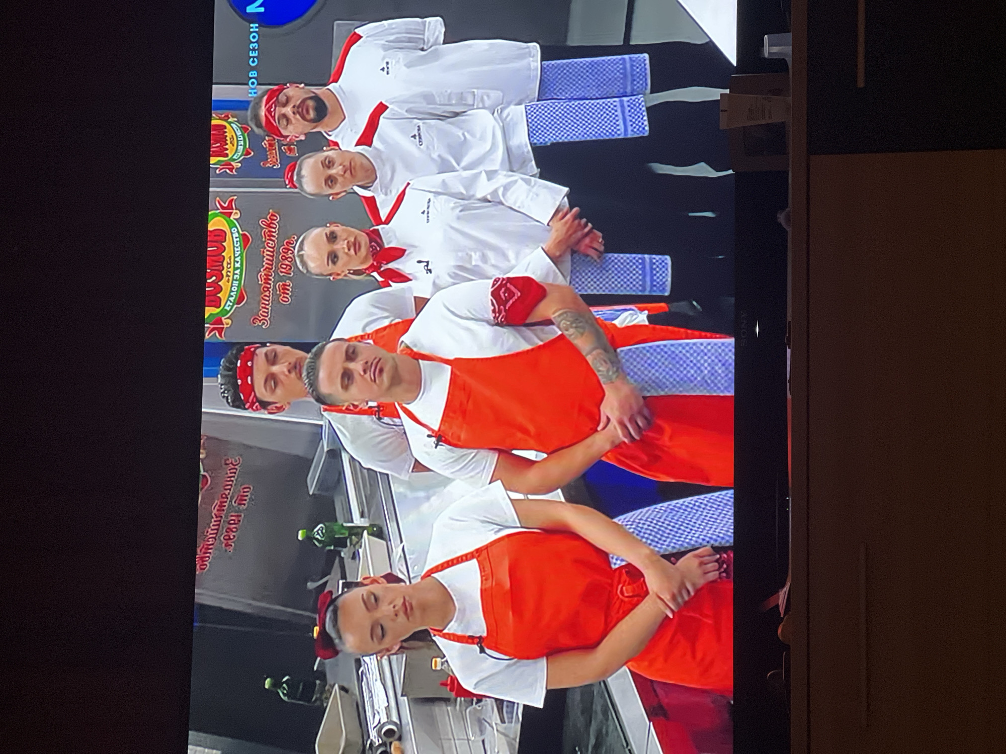 The image captures a scene from a cooking competition show, potentially filmed in Bankya, Bulgaria, based on the branding visible. Six individuals are lined up, likely contestants. The top three are wearing traditional chef whites with red accents, blue and white checkered pants, and the bottom three are in white t-shirts and bright orange aprons. The contestants all have their hands placed in front of their midsection. Behind the contestants in orange aprons is a stainless steel counter with various kitchen items, like bottles, containers, and what appear to be rolls of plastic wrap. Background imagery includes branding for a food product with the text "Запазиш моменти от 1989г.". A logo that looks like the letter N is visible.