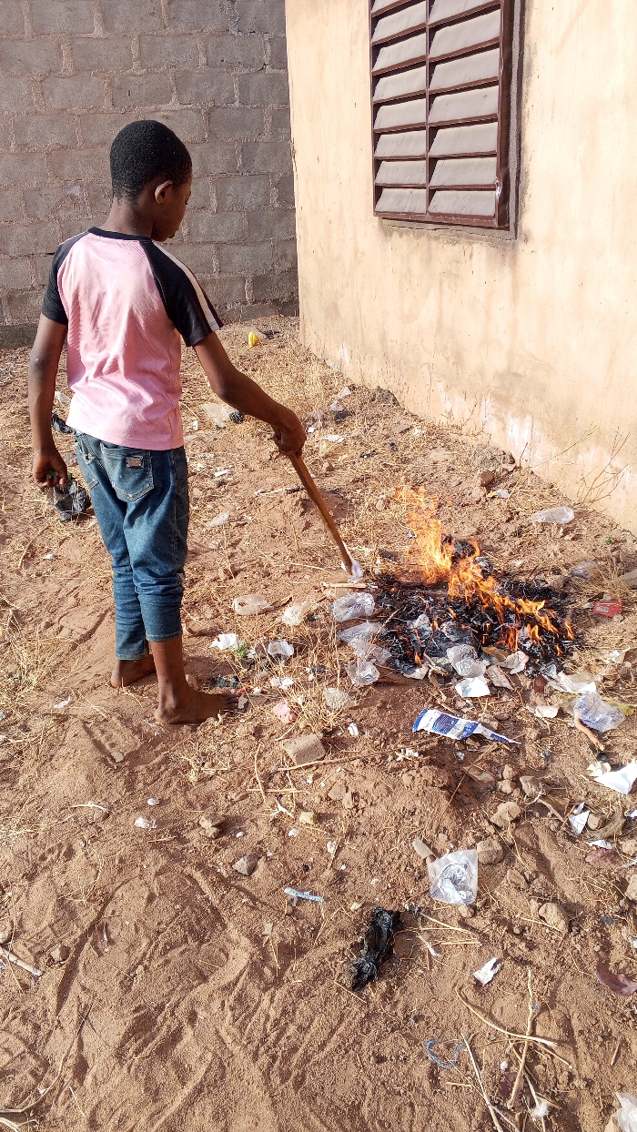A young male, possibly a boy, is depicted from a rear-right perspective in an outdoor setting in Tempure, Nigeria. He wears a pink t-shirt with black short sleeves and blue jeans, and is barefoot. His left hand holds a dark object, while his right hand holds a wooden stick, the end of which is positioned near a small, active fire on the dirt ground. The fire is consuming various pieces of debris, primarily plastic items such as bottles and wrappers, with orange flames and dark smoke visible. Surrounding the fire and extending across the sandy-dirt ground are scattered pieces of similar refuse and dry vegetation. In the background, a light-colored, possibly ochre-painted, wall of a building features a rectangular window with horizontal brown louvered panels. To the left of this wall, a section of an unpainted grey concrete block wall is visible. Sunlight indicates daytime conditions.