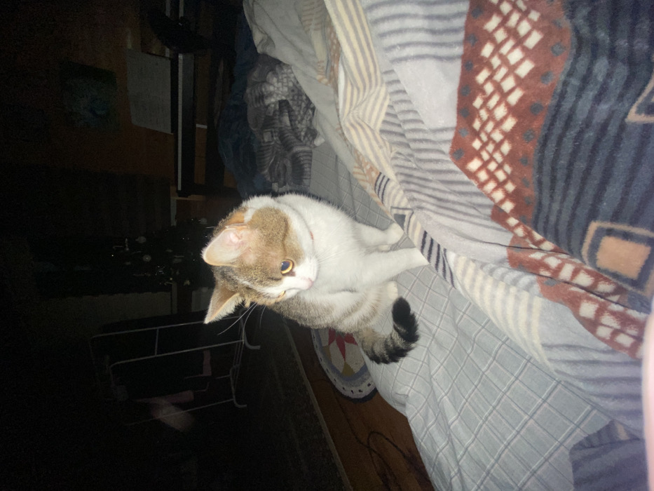 The image depicts an indoor scene in Прикамский, Russia, characterized by low light conditions. The primary subject is a domestic cat, likely a short-haired tabby, exhibiting patches of white on its chest, face, and belly, contrasted with brown, tan, and grey tabby markings on its head, back, and a distinctly striped black and grey tail. The cat wears a thin red collar and is seated upright on a light blue and white plaid-patterned sheet, with its head turned downwards and to its left, eyes reflecting a yellowish hue. To the immediate right of the cat is a multi-colored blanket or comforter featuring geometric patterns in shades of brown, blue, and white. In the background, visible through the dim lighting, are several household items: to the left, a round rug with a geometric design rests on a wooden floor, next to a dark, indistinct furniture piece resembling a clothes rack. Further into the background, a decorated Christmas tree with faint lights is visible, alongside a dark musical instrument, likely a piano or keyboard, with sheet music on a stand. No human figures are present.