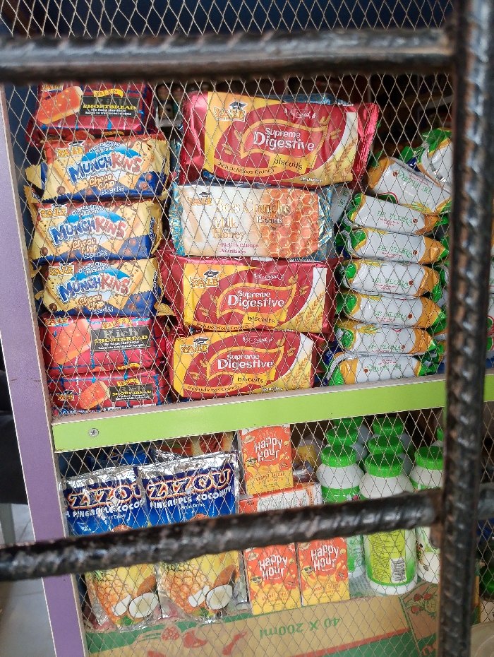 The image displays a retail food items display shelf, observed through a metal mesh grid, located within a commercial establishment in Nyanya, Nigeria