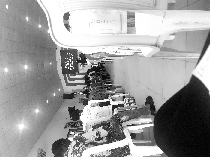 This black and white image depicts the interior of an assembly hall or religious venue, located in the city of Unknown, Unknown. The perspective is from a seated individual within the audience, looking towards the front of the room. The environment features light-colored tiled flooring and white walls. The ceiling is constructed with acoustic tiles and contains multiple recessed circular light fixtures. On the left wall, a wall-mounted fan is visible. At the front of the room, a large, dark screen displays the text "Psalm 23:1 The LORD [is] my shepherd; I shall not want. (KJV)". Speakers are mounted on the wall to either side of the screen. In the left foreground, a person is seated in a white plastic chair, viewed from the back and left side. This individual wears a patterned light-colored shirt, dark distressed jeans, and dark slip-on shoes. Items resembling books or bags are situated on the floor beneath their seat. In the right foreground, the back of another white plastic chair is visible, with the word "CHURCH" stylized on its backrest. The lower portion of the photographer's legs, dressed in dark attire, is visible at the bottom of the frame. Numerous individuals are seated in orderly rows of white plastic chairs, extending towards the front of the room, predominantly viewed from behind. A figure is positioned near the screen at the front, suggesting a leader or speaker. The scene indicates an ongoing assembly or religious service.