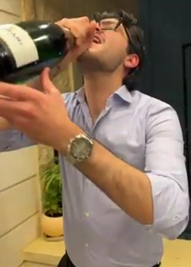 A man is seen holding a bottle of green liquid, likely alcohol, and drinks directly from the bottle. He wears glasses, a light blue dress shirt, and a watch. The scene appears to be indoors, perhaps in a modern home or apartment, judging by the wall in the background. He drinks from the bottle until it pops.