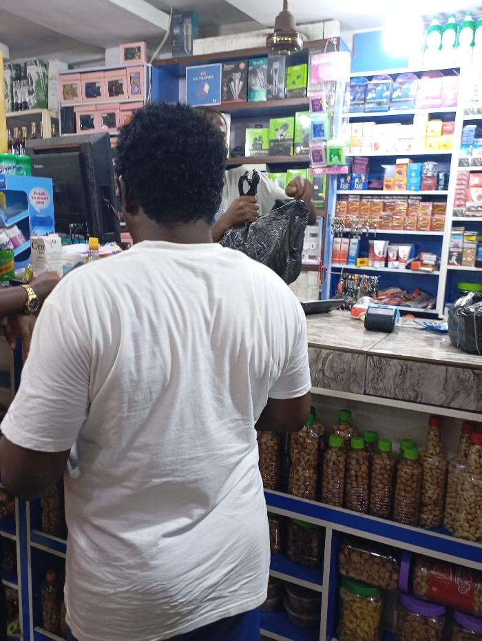 A man in a white t-shirt stands in a store, facing away from the camera. Another person, partially visible, holds a black plastic bag. Shelves are filled with various products, including bottled nuts and other consumer goods. A cashier's counter is present with a payment terminal. The lighting suggests an indoor setting, possibly a convenience store or small shop.
