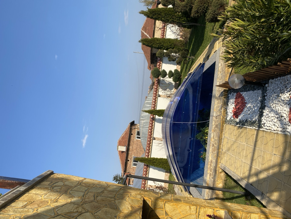 This image depicts an outdoor residential property located in Kovachevo, Bulgaria, under a clear blue sky with minimal cloud cover. The scene is dominated by a covered swimming pool or water feature in the mid-ground, featuring a translucent blue, arched telescopic enclosure over a stone-lined basin. To the left of the pool, a section of a building or wall constructed from textured, yellowish-brown stone blocks is partially visible, extending upwards from the lower left corner. In the immediate foreground and running towards the center, a paved pathway made of light-colored, interlocking square pavers with a circular pattern is present. Adjacent to this pathway on the right, a landscaped bed contains white decorative pebbles, interspersed with red pebbles arranged to form a heart shape. A small, low wooden fence borders this pebble area, and a white, globe-shaped outdoor light fixture stands nearby. Lush green grass and various manicured shrubs and bushes, including topiary forms, are visible on a gentle slope beyond the pebble bed and to the right of the pool. In the background, a low white wall with terracotta-colored coping runs horizontally, acting as a boundary. Behind this wall, several residential structures are visible, characterized by red-tiled roofs. A prominent two-story brick building with a red tiled roof and a chimney is positioned towards the left background. Other buildings with similar red roofs are visible further right. Several tall, slender coniferous trees are planted along the white wall, interspersed with other deciduous trees. Overhead, utility lines traverse the background against the sky. No individuals are present, and no actions or interactions are depicted. The lighting suggests a bright, sunny day.