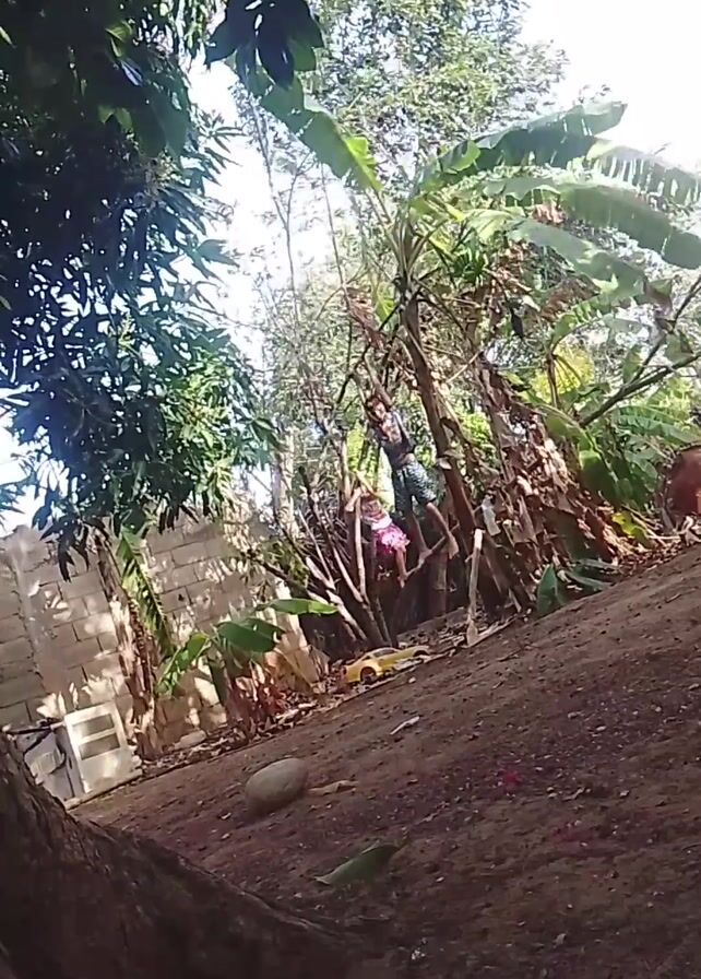 In a daytime shot taken from a slightly low angle, a lush backyard scene unfolds. A young boy, dressed in a blue and white patterned shirt, appears to swing down from a tree with prominent banana leaves, landing lightly on the ground. To his left, another child in a pink shirt sits in the tree. The ground below is dirt and strewn with organic debris like leaves and what appears to be a fallen coconut. A faded yellow toy truck sits near the base of the trees. A weathered concrete block wall runs along the left side of the frame. The left of the scene is dominated by a large tree with dark green leaves that obscure the view.