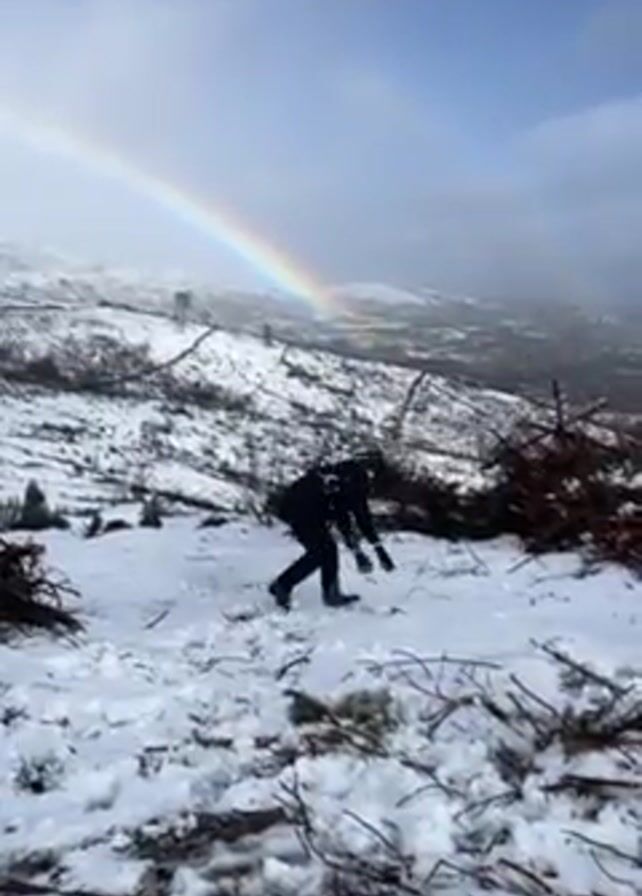 Two people in black coats engage in a snowball fight in a snow-covered mountainous landscape. A vibrant rainbow arcs across the sky in the background, with the lower part of the scene cluttered with branches and debris. The sky is partially overcast, with a visible vista beyond the snow-covered landscape.