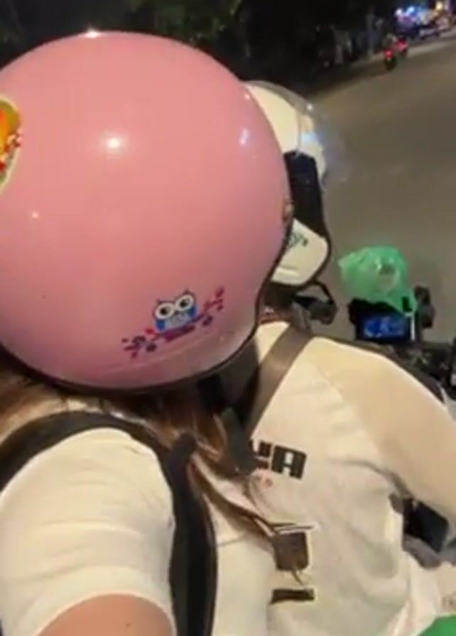 Two people are riding on a motorcycle at night. The person in the back is wearing a white shirt and a pink helmet with an owl sticker. The person driving is wearing a white helmet and a white shirt with black Puma lettering. The street is lit by streetlights and Christmas lights, and other vehicles can be seen in the distance.