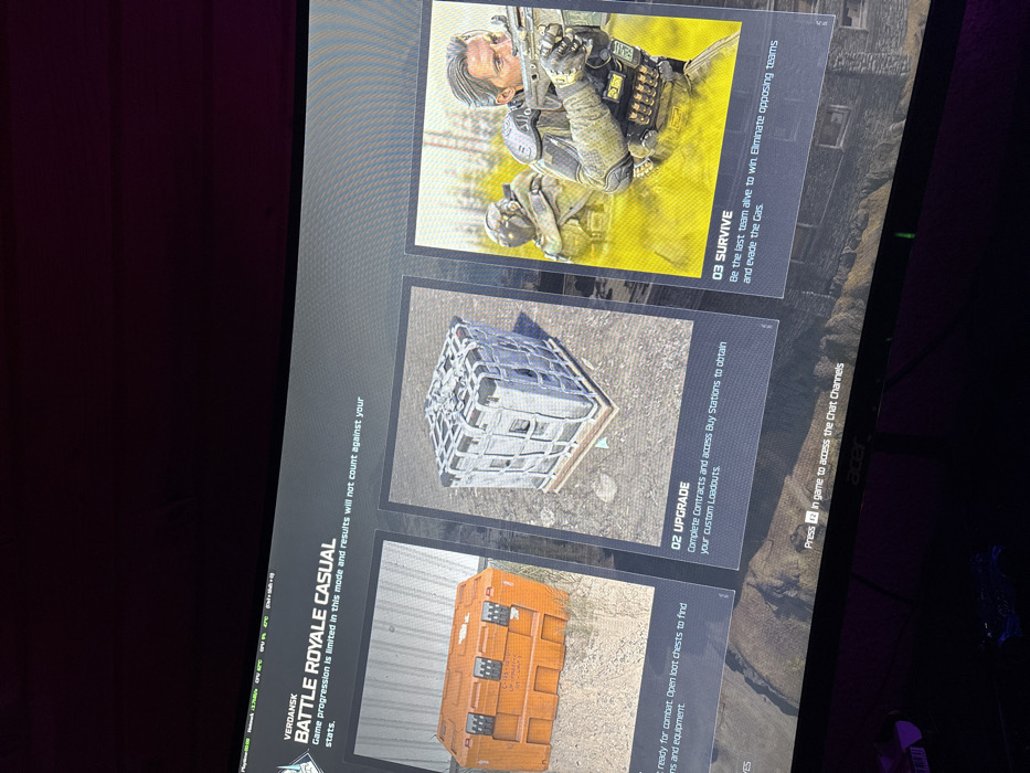 A photograph captures a curved computer monitor displaying a video game menu in a dimly lit indoor environment. The monitor, bearing an "Acer" logo at its bottom center, shows the title "VERDANSK BATTLE ROYALE CASUAL" at the top. Below the title, text indicates that "Game progression is limited in this mode and results will not count against your stats." Performance statistics, including FPS, CPU, GPU, temperature, and VRAM, are visible in the top left corner of the screen. The central part of the screen features three vertical panels, each illustrating a game mechanic: 1. The leftmost panel displays an orange, rectangular military-style loot chest resting on barren ground. Associated text, partially visible, references "loot chests to find items and equipment." 2. The middle panel depicts a gray, metal, cage-like supply crate secured with white netting, positioned on a wooden pallet. The accompanying text reads: "02 UPGRADE. Complete Contracts and access Buy Stations to obtain your custom Loadouts." 3. The rightmost panel features a male character with short, dark hair, wearing green tactical gear and holding an assault rifle, looking rightward with an intense expression. A second, blurred soldier is visible in the background, all within a yellow-green hazy environment. The text for this panel states: "03 SURVIVE. Be the last team alive to win. Eliminate opposing teams and evade the Gas." At the bottom of the screen, the instruction "Press F2 in game to access the Chat Channels" is visible. The immediate physical environment surrounding the monitor is dark and devoid of distinguishing features. The physical location of the scene depicted in the photograph, specifically within the city of Stefan Karadja, Bulgaria, cannot be determined from the image provided. The game itself is set in a fictional location called Verdansk.