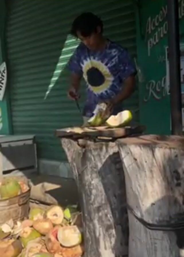 A young man is shown cutting into a coconut on a wooden stump. He wears a tie-dye t-shirt with a large circle in the center. He uses a knife to carefully cut away the flesh of the coconut. There's a large pile of discarded coconut shells and husks nearby. A green corrugated metal shutter is behind the man. Part of a sign reading "Accesorios para" and "Reg" is visible on the shutter.