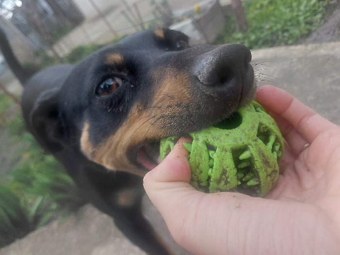 - "A close-up image depicts a black and tan dog interacting with a human hand holding a green, textured toy ball" by FM-6t0r93, licensed under CC BY 4.0