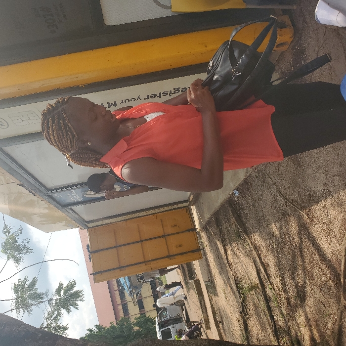 The scene depicts an outdoor urban environment in Ihiagwa, Nigeria, under a partially cloudy sky. In the foreground, a woman of African descent with braided hair, wearing an orange sleeveless collared shirt over a white undershirt and dark trousers, is seen manipulating a black handbag or small backpack with both hands, looking downwards. She stands adjacent to a yellow mobile telecommunication service kiosk, identified by "MTN" branding and text fragments such as "register your M" and "301#". Behind her, a man is partially visible, standing near the same kiosk. The ground in the immediate foreground consists of bare earth with visible pathways or tracks. In the mid-ground to the left, a large yellow container-like structure is present, near which a white passenger van is parked. Multiple indistinct figures are observed in the vicinity of the van and the container, including an individual in white attire and another on a motorcycle. In the far background, a large building with a reddish-brown roof and light-colored walls is visible. A tree trunk and some branches with green leaves partially frame the left side of the image.