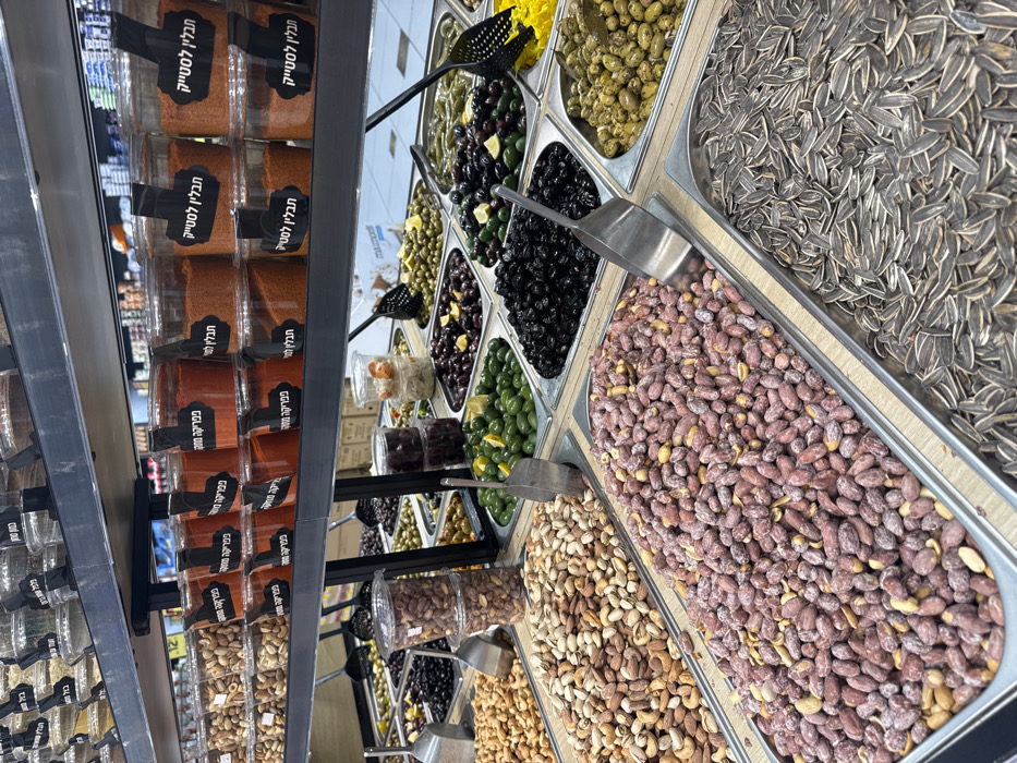 This image captures a brightly lit bulk food display within a market or supermarket in Afula, Israel