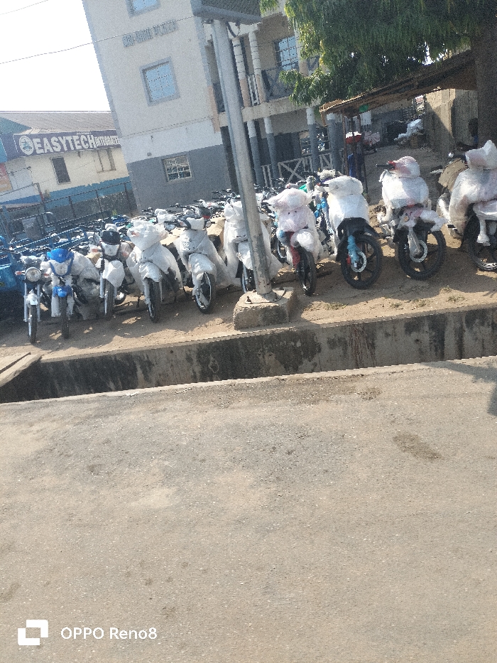 The image displays an urban commercial scene in Lokoja, Nigeria, specifically located opposite the Lokoja Local Government Secretariat, near Gold-Mine Plaza and Easytech Integrated. In the immediate foreground, a light-colored asphalt road occupies the lower portion of the frame. Directly beyond the road is a concrete drainage ditch. The midground features several rows of parked motorcycles. Many of these motorcycles are new, still partially encased in white protective plastic coverings. Others are uncovered, revealing various colors including blue, black, white, and red. A large metal pole, anchored by a concrete base, stands among the parked motorcycles. In the background, two multi-story buildings are prominent. The building on the right is a light-colored structure identified by the sign "GOLD-MINE PLAZA" visible near its top. To the left of Gold-Mine Plaza, another multi-story building features a large sign for "EASYTECH INTEGRATED" above a blue fence. Further to the right, beyond the Gold-Mine Plaza building, trees and a less defined structure with a corrugated metal roof are visible. The scene is illuminated by natural daylight. No individuals or specific actions are discernible within the frame.