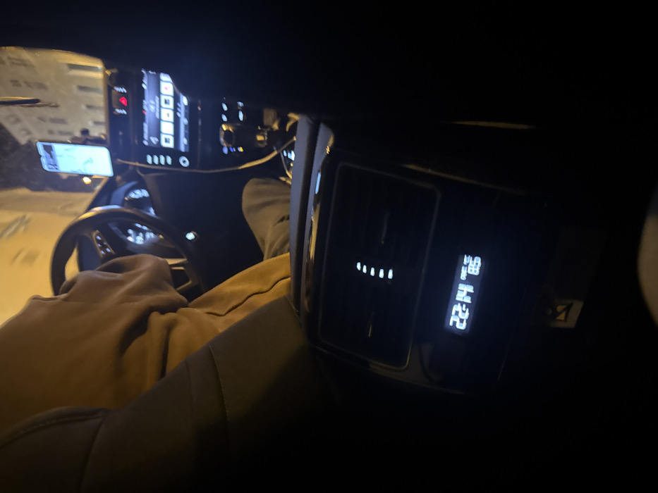 The image captures the interior of a vehicle at night, observed from a rear passenger perspective, within the city of Krems an der Donau, Austria. In the foreground, the rear climate control unit is prominently visible, displaying the time "22:14" and a temperature of "8.5°," accompanied by five illuminated vertical indicators, likely representing fan speed. A small yellow triangular symbol is present below this display. A person, identified as the driver, occupies the front left seat, wearing a light brown or tan hooded garment and dark trousers. Their hands are positioned on or near the steering wheel. A smartphone is mounted on the dashboard, displaying a map or navigation application. The vehicle's dashboard and center console are illuminated, revealing a digital infotainment system with various buttons and controls, and a visible gear selector area. Through the front windshield, blurred, illuminated building facades are discernible, indicating an urban setting at night. The scene is primarily lit by internal vehicle illumination and external street lighting.