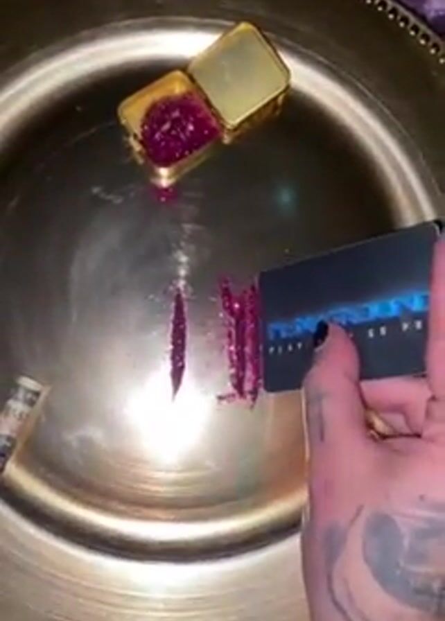 A person with tattoos on their hand is arranging small lines of pink glitter on a gold plate using a credit card
