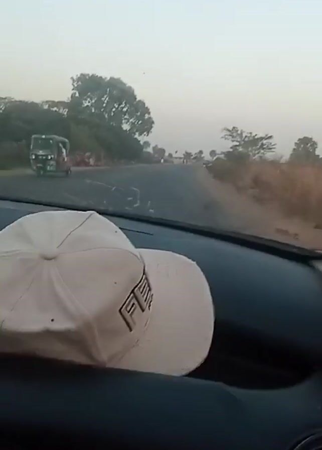 A car is traveling on a paved road. The landscape visible through the windshield includes dry vegetation, trees, and hills in the distance. A beige baseball cap with the letters "FB" on it is placed on the dashboard. A motorcycle is seen driving in the same direction as the car, and there are people walking along the side of the road. The sky is overcast. The footage is taken from inside the car, capturing the view through the front windshield and a side mirror.