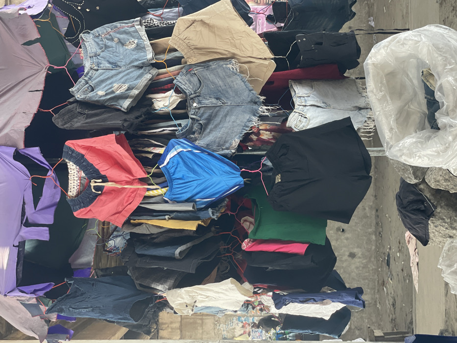 The image captures an outdoor market stall in Satellite Town, Nigeria, displaying a dense array of assorted clothing items