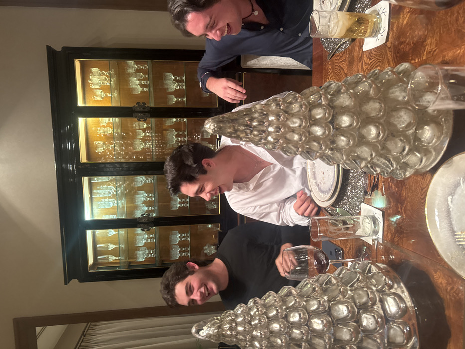 Three young men seated at a dining table are laughing. In the foreground, two decorative silver objects resemble pinecones. The table is set with plates, glassware, and decorative place settings. In the background, a large black cabinet displays glassware. The men are wearing a dark shirt, a white shirt, and a blue shirt respectively.